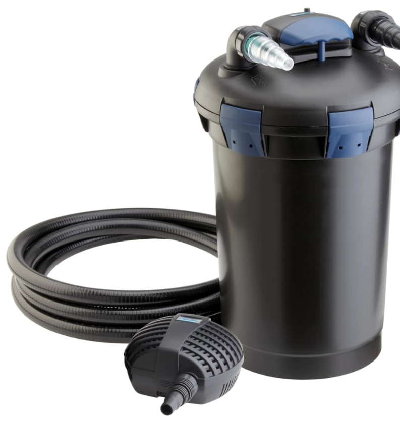 Ready, set, go: The BioPress Set 10000 complete pressure filter set has optimum start-up properties. Thanks to the perfect coordination between the 3400 l/h filter pump, the pressure filter and the integrated 11 watt UVC pre-clarifier, ponds up to 10 m³ (with fish up to 5 m³) are guaranteed to be clear. Even higher-lying streams are easily supplied with water. The complete set is therefore quick and easy to connect with the 5 m hose that is also included. The same applies to the necessary cleaning, as this is carried out from the outside and is also displayed there beforehand. Reliable OASE quality: You receive a 2-year guarantee plus a clear water guarantee.
