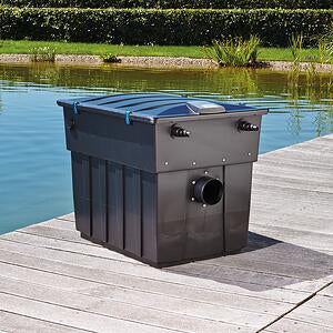 The BioTec ScreenMatic² 90000 flow-through filter supplements the BioTec ScreenMatic² product range (40000, 60000, 90000, 145000) with an intermediate size (788 x 590 x 645 mm). Guarantees excellent cleaning results for ponds up to 45 m³ with fish stocking. The inlet and return (DN110) are located on one side for easy handling. Long service life thanks to automatic coarse dirt separation before entering the filter. The filter belt cleans itself automatically. Also available as a complete set with AquaMax Eco Premium 20000 and Bitron C 110 W. 2-year guarantee + 1-year request guarantee.