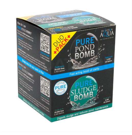 The Evolution Aqua Pure Pond Duo Pack contains 1 x PURE Sludge Bomb and 1 x PURE Pond Bomb providing the perfect combination to improve the water quality in your pond.
